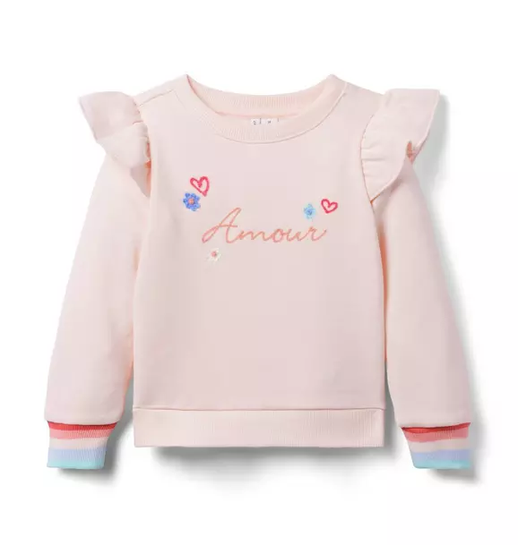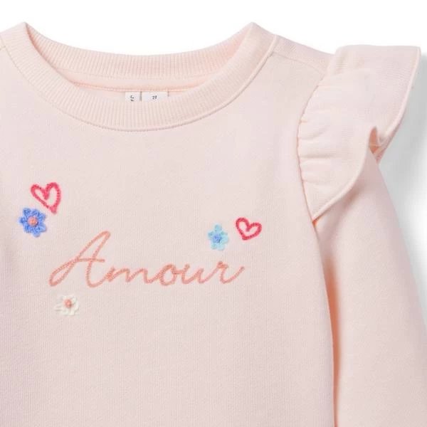 - All you need is love—and this cozy fleece sweatshirt. Featuring a chainstitched Amour graphic, plus extra frills, thanks to ruffle shoulders and brightly striped cuffs.