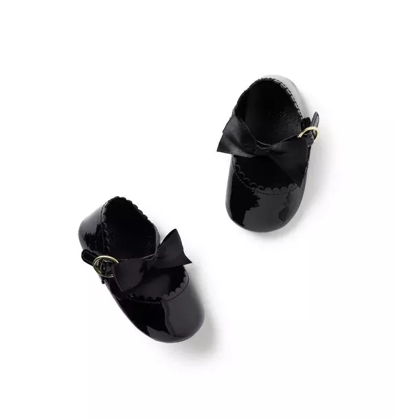 - A shiny new pair for baby’s next occasion. Detailed with a little scalloped edge and finished with a satin ribbon bow.