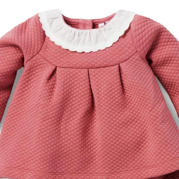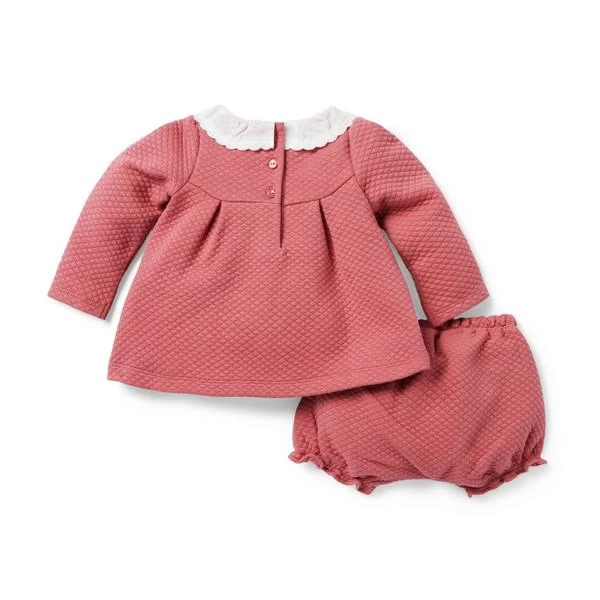 - For effortless style that’s always a match, reach for this soft quilted set with a ruffle collar and crisp pleats. A scalloped crochet edge detail adds the perfect finishing touch.