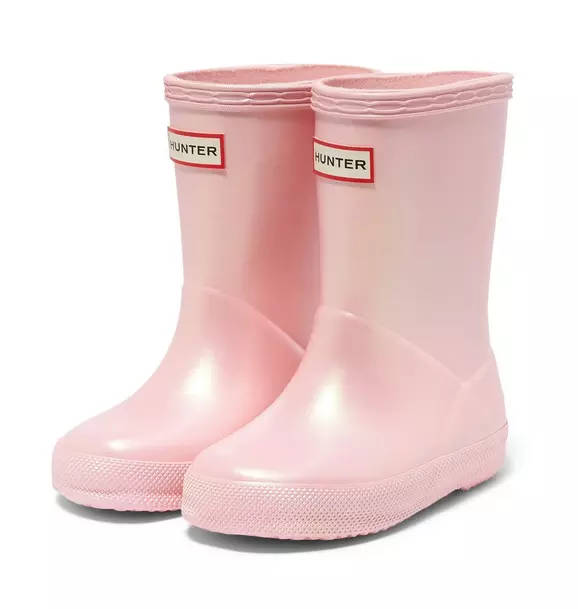 - Like sunshine on a rainy day, these pearlized iridescent boots from Hunter will brighten every moment. Handcrafted and designed with a special tread to reduces slipping, which means they can splash even more.