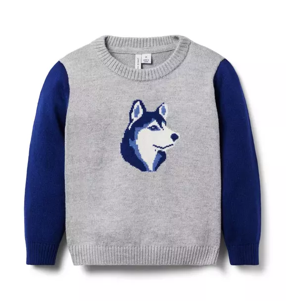 - With an intarsia-knit husky and colorblocked sleeves, this soft crew neck sweater brings a cozy feel to any outfit.