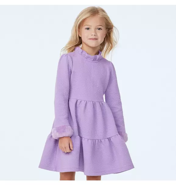- A quilted classic with cozy details to love, from its tiered skirt to its ruffled collar and plush faux fur cuffs. Perfect for holiday occasions, or anytime.