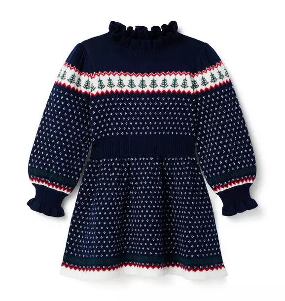 - The coziest way to get dressed up for the holidays. Our festive Fair Isle sweater dress detailed with trees, plus a ruffled collar and cuffs and a ribbed waist for total style-meets-comfort.