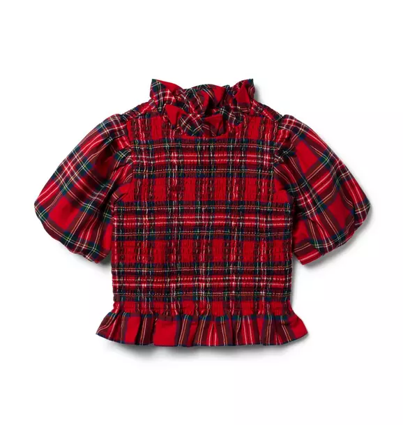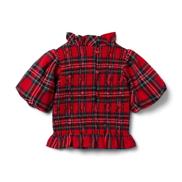 - Their new holiday go-to? This cropped twill top with a smocked bodice, ruffle details and voluminous bubble sleeves. In family-matching tartan for picture-perfect style.