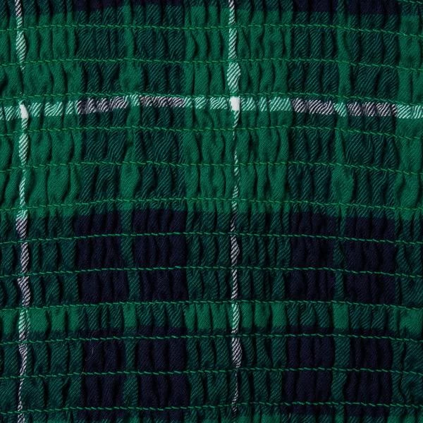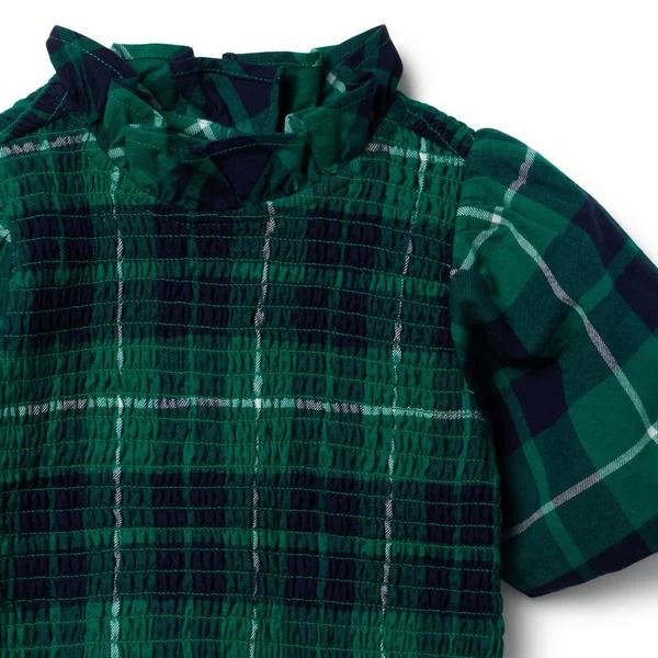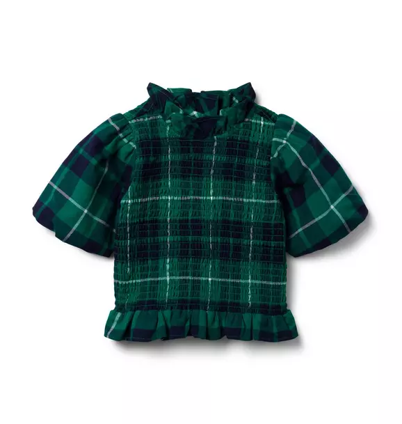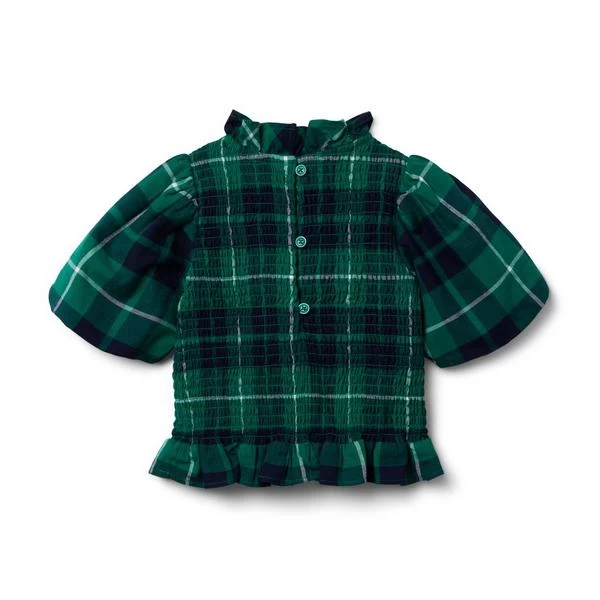 - Their new holiday go-to? This cropped twill top with a smocked bodice, ruffle details and voluminous bubble sleeves. In family-matching tartan for picture-perfect style.