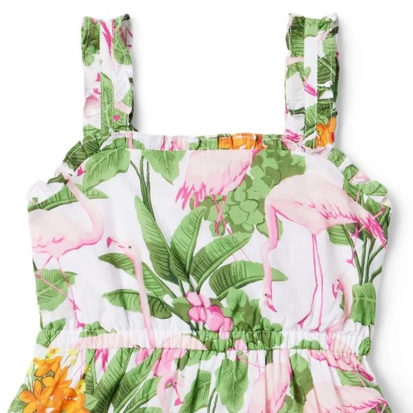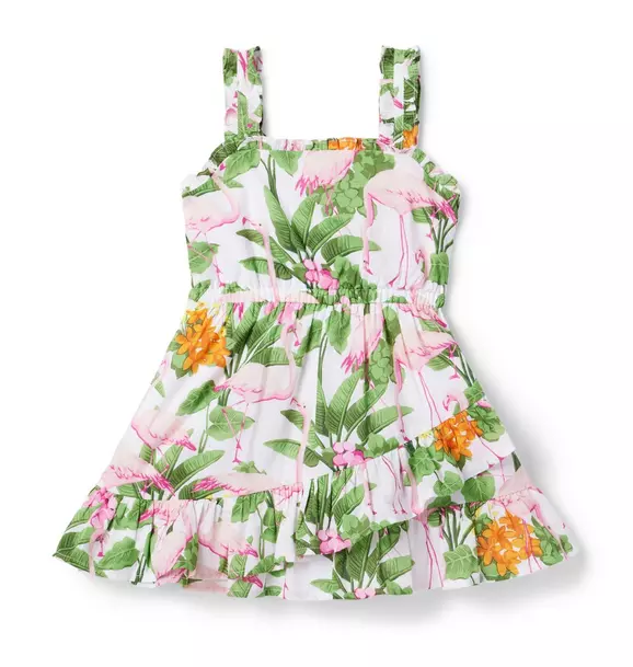 - A vacation standout, our tropical flamingo print dress has a faux wrap skirt and ruffle trim details. Plus, an elasticized waist for a perfect fit.